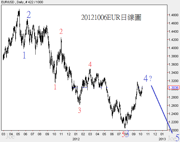 1. 請教您 20121006EUR日線圖 回檔修正的第三波裡的五小波 也就是紅色字的第1波低點與第4波高點可以重