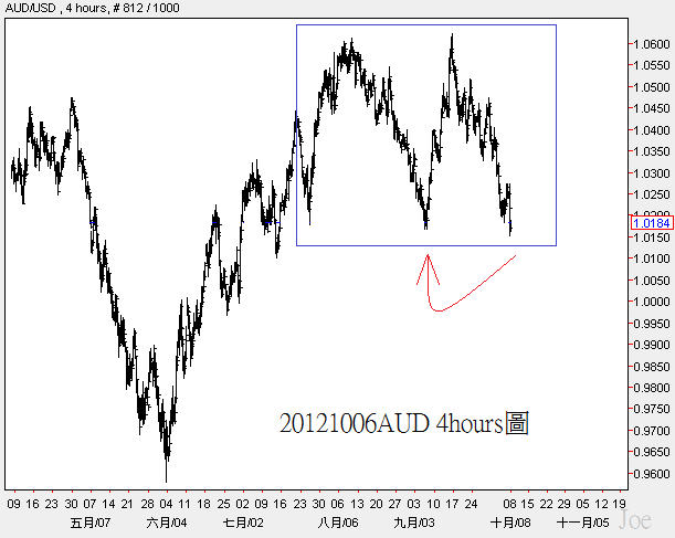AUD的盤整結果形成了M頭的模式,而且跌破紅色箭頭的前低浪,US$1.070並沒有出現,M頭形成壓力,US$1.0624恐怕是今年的高點,美國大選前,不得不分批調降AUD的比例