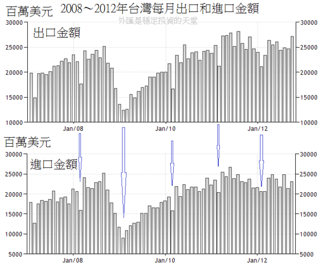 ,金額大約等於2011年11月份的數據,不過進口金額卻沒有超過2012年的高點,顯示台灣進口幅度還不理想,出口業的景氣還沒有讓企業老闆願意擴大進口材料的情況