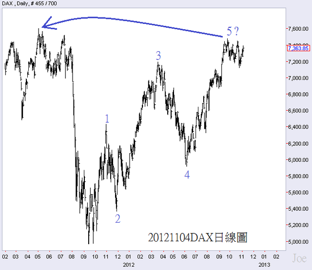 DAX並沒有超過2011年的高點,所以短線第五浪也可能已經結束,操作和美股類似,只能找機會出,不適合進場