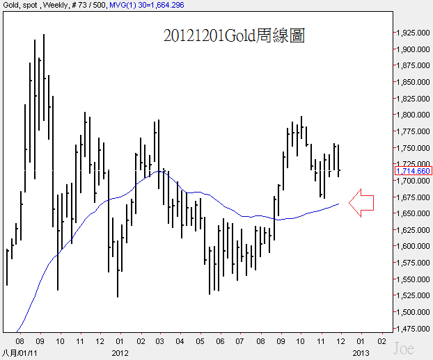 應該把我說的前提給納進來,這樣句意才完整,Gold得持續維持在周線30的均線之上,美國財政懸崖後,聯準會的動作還會刺激Gold上漲,但時間上得出現延後,今年上半年原本預估QE3以後,金價能受到量化寬鬆而帶動上漲的情況,確實沒有出現,上漲波段比預估的來的慢,只好等2013年第一季以後了
