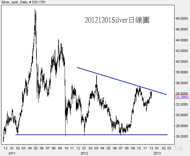 | Gold | ![]() Gold在2013年第一季結束前,理論上還會再回測一次紅色箭頭價位,那會是理想進場點,繼續耐心等待 |