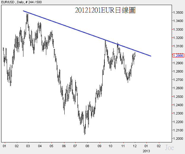 | EUR | ![]() 上週歐盟談判暫時解決了希臘問題,接下來12月份義大利和賽普勒斯問題,會慢慢浮現,EUR價格未突破藍色斜壓力線,請繼續耐心等待,未來一季的局勢仍然對EUR不利 ![]() 2012年12月~2013年4月以前,都是歐債到期的高峰期 |