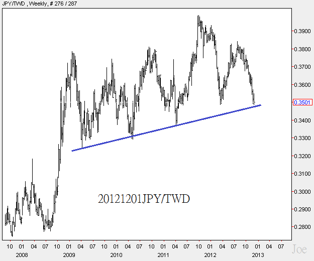 | JPY/TWD | ![]() 現在是近一年來,JPY對TWD最弱的時候,剛好壓在2009年以來JPY/TWD的斜支撐線上,如果接下來的交易日,USD/TWD亞洲盤中出現一路上漲的走勢,那麼對JPY有需求的人,就可以考慮分散買進一些了 |