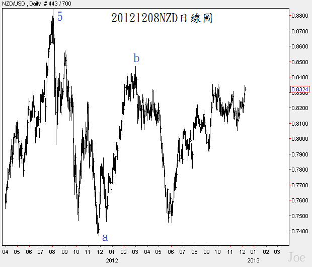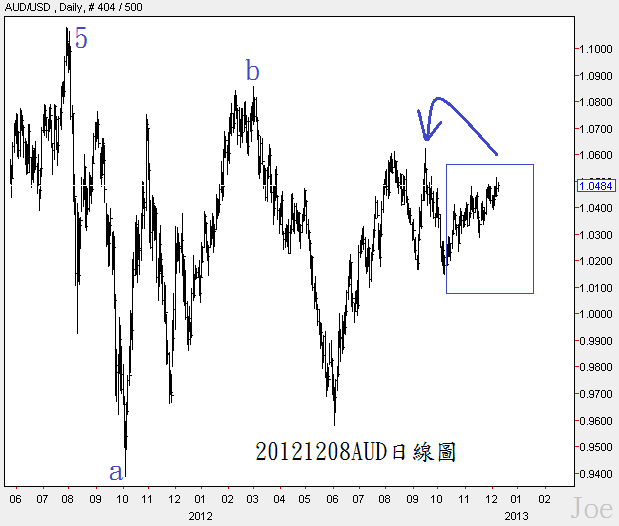 頭肩底型態的漲勢已經接近滿足,如果後勢繼續出現上漲波段,那麼就得等月底的聖誕節過後,才會再出現較大規模回檔調整的可能性,波浪結構上,日線圖也是照舊,突破b浪才會改變線圖的畫法,目前仍然不建議持有太多AUD,NZD或CAD