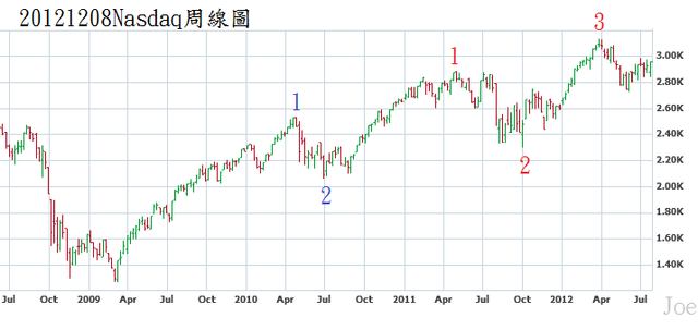 | Nasdaq | ![]() Nasdaq的型態明顯是比Dow Jones來的好,按照第三浪不為最短浪的原則,發生機率最高的線圖暫時只能畫這樣,等到有更多的資訊出現才會再做改變,目前仍然是等待紅色4的來臨 |