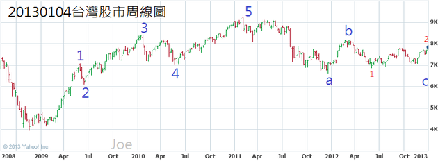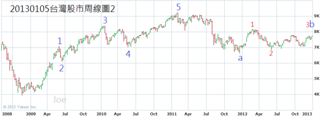 情況一的b浪的三浪結構較不明顯(藍色框框標示),單純從線圖來看,情況二的發生機率較高,但考慮全球總體經濟和台灣的內需成長幅度因素,仍然以情況一作為短線參考,投資人可以自行當作資訊參考