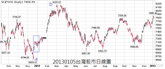 2013年第一季的通貨膨脹跟2012年同期相比,持平2%或2%以下的機率較高,央行如果能維持匯率在29.0以上,對台股依然相對有利,第一季比預期的局勢來的樂觀,因為美國把問題給延後了,投資風險暫時也還未發生,但對台股的看法仍然是保守的,第一季依然是盡可能空手為主,如果能有較大幅度的回檔,才能有機會進場,當然,有把握的投資人可以自行分批進場,沒把握的投資人可以持續維持觀望
