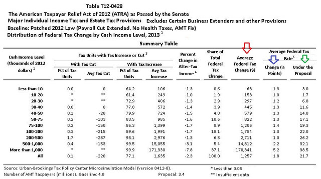 美國智庫Tax Policy Center整理資料顯示,失去了工資稅抵扣,2012年的「美國納稅人救助法」(American Taxpayer Relief Act)使全體美國人負擔的平均實際聯邦稅率為21.7%(下圖綠色箭頭欄),平均增稅1257美元(下圖紅色箭頭欄)。