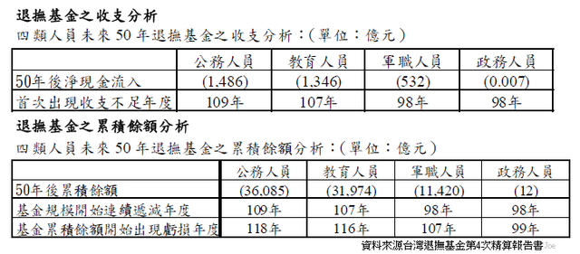公務人員部分,2012年繳費收入為277億元,退撫支出為203億元,繳費收入雖比退撫支出多74億元,但2011年繳費收入比退撫支出多104億元,公務人員退撫基金2012年繳費支出是退撫收入的73%,也比2011年的61%,成長達12%,財務惡化問題也愈來愈嚴重。