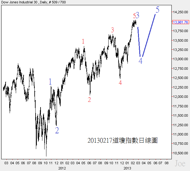 美股的波浪結構仍然維持在日線圖可能改變的關鍵點上,上週主要在14000附近帳盪,按照第三浪不為最短浪的原則,美股仍然維持會先出現一波小回檔(藍色4)的看法,回檔幅度大約類似藍色2或紅色2和紅色4,暫時只能等美股拉回,然後增持美股