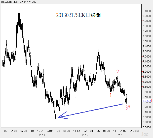 目前SEK大約是兩季的三浪結構,上半年得等SEK在發展出更多的訊號,Joe認為未來的強勢貨幣會是美元,所以USD/SEK下跌低於藍色箭頭價位的機率較低,SEK和其他歐系貨幣(CHF除外)應該在今年逐漸轉為弱勢的機率較高