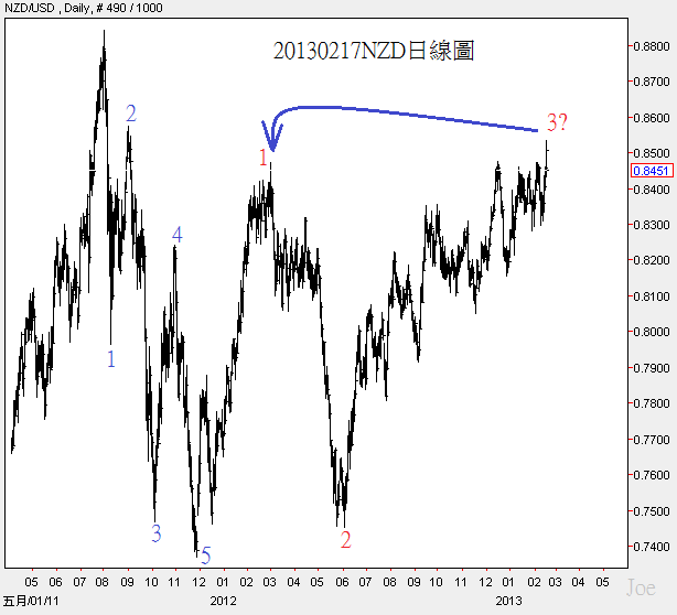 因為NZD出現超過紅色1浪的新波浪,2011年下半年,NZD有個較明顯的5浪結構,所以作圖預估2012年以後是3浪結構,目前無法判斷紅色3可以上漲到哪個價位,短線上要跌破0.830的機率較低,2013年的NZD理論上還是會維持上漲趨勢