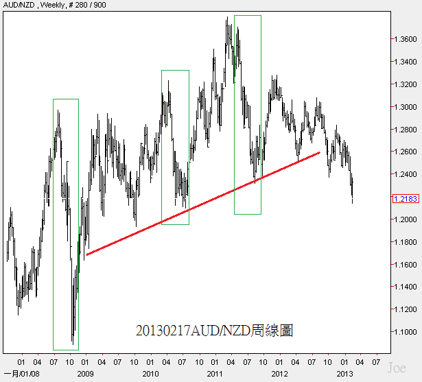 除了美元的趨勢正在轉強,AUD/NZD也出現了新的變化,2009年以來,AUD/NZD幾乎都維持在紅色斜線以上,綠色的驟跌行情大多是在市場出現投資風險時,例如2008年次級房貸,2010和2011年歐債風暴,但目前AUD/NZD卻在市場沒投資風險時持續下跌,目前仍然無法判斷這個新趨勢帶來的後續影響力,但全球貨幣新趨勢正在形成是個進行式的事實