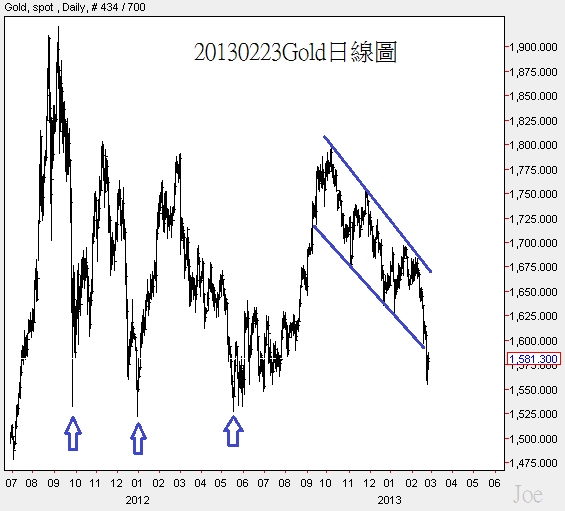 金價跌破藍色線區間後,直接下跌,短線上再度測試藍色箭頭價位的機率極高,大約是US$1525附近,等測試狀況出爐再來分析新局勢