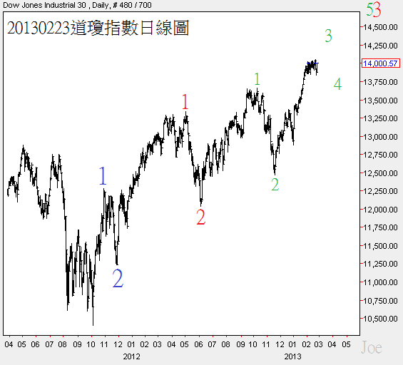 這是美股目前發生機率第二高的波浪結構,上週收盤正式攻上14000,2月17號所畫的線圖機率仍然維持最高,短線上美股若有百點以上回檔,依然是緩和增持美股,務必做好籌碼控制,避免大修正出現,美股持有成本太高,盡可能分散多次出手
