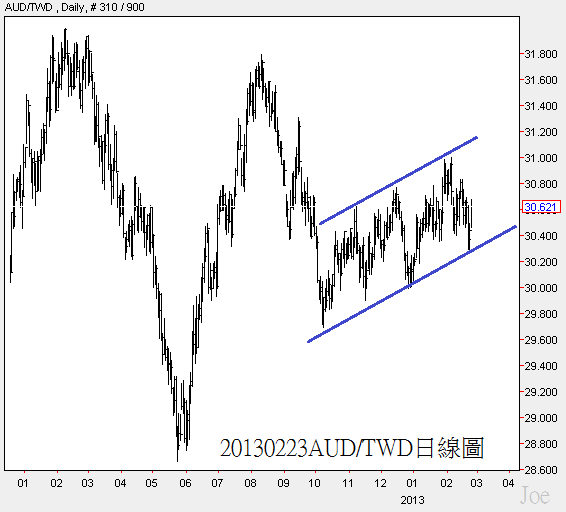 最近USD/TWD也出現較大的震盪,所以直接用AUD/TWD來分析,目前的型態觀察起來,近一季內下跌的機率較高,除非日幣擴大貶值,那麼就可以緩和AUD的跌勢,或者是TWD本身走跌,AUD/TWD短線上還可以維持在29.50以上
