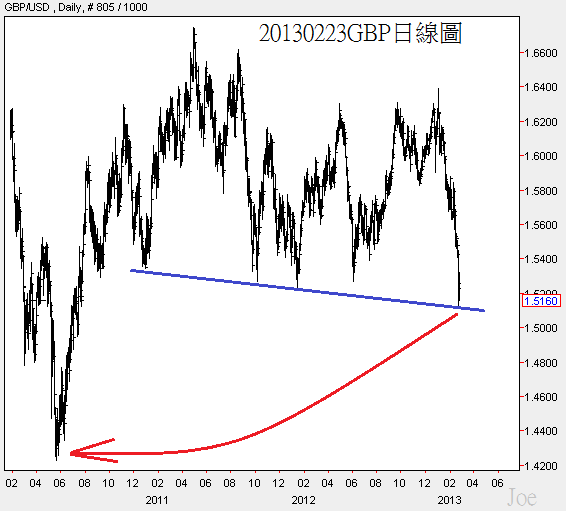 GBP直接跌破上周分析的支撐價格,隨著USD慢慢走強,GBP在未來2~6季內,會再度出現紅色箭頭價位的機率頗高