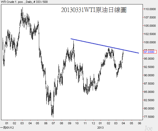 WTI原油來到了壓力線的位置,北美的經濟成長促進能源需求是比較明顯的,如果WTI油價能維持在US$80~95之間震盪,這樣美國的民間消費成長會更持久