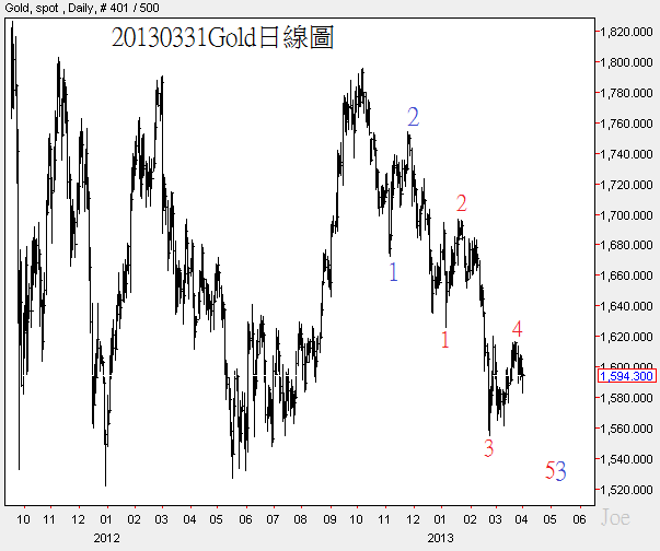 金價短線的波浪結構是有利於下跌的,但是變化會頗為緩慢,藍色3如果跌破US$1525附近的價位,那麼金價的空方才會再度引導金價大跌