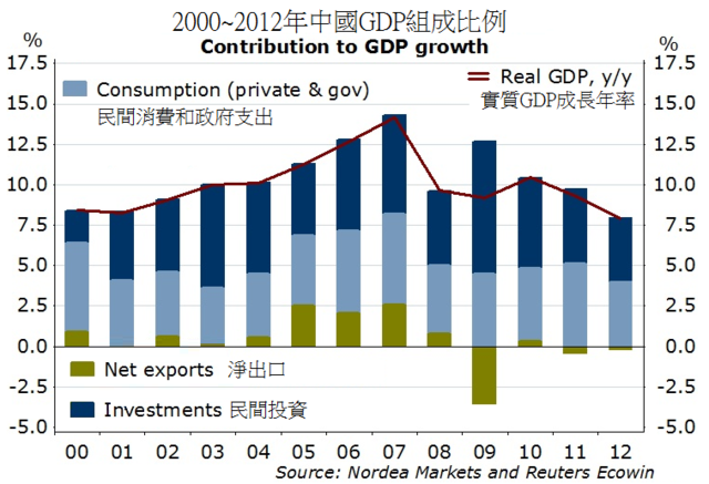–>民間消費、民間投資、進出口、政府支出是目前全球衡量國家經濟發展的數字系統,除了判斷國家經濟是否成長,還可以用來判斷經濟建設的各個項目是否發展健全,以美國為例,美國經濟成長動力來源是以國內民間消費為主的經濟體,民間投資和進出口為輔,這種經濟模式可以有效的避免國外的經濟蕭條干擾,而在亞洲,中國則是典型靠民間投資為主,民間消費和進出口為輔的經濟體,利用人口紅利、匯率調整、企業保護政策和資本管制,經營產業代工,做為歐洲和美國等國家的海外生產商品地點,透過提供低成本的勞力資源,支撐國內的經濟發展,維持就業環境,讓人民賺出口財維生,但中國國內的內需經濟比重則明顯偏低。