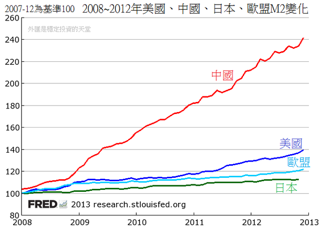 (2008年第一季,中國M2約42兆人民幣,日本M2約732兆日圓,美國M2約7.48兆美元,歐元區M2約7.45兆歐元)