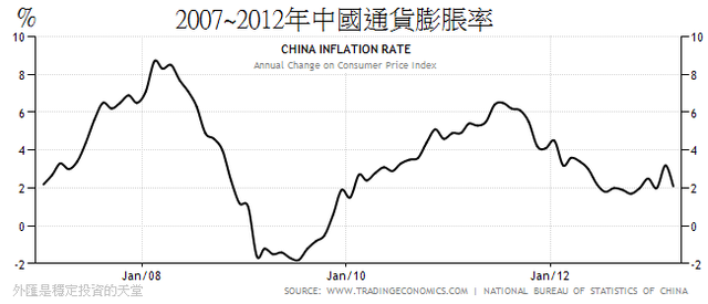 中國的廣義貨幣供應量從2008到2013年成長到240%,雖然中國國民可支配所得近五年來也有明顯的提升,但仍然比不上貨幣供給的速度,這些資金一部分透過民間消費,刺激通貨膨脹的成長,一部分流進了房地產業,2012年中國政府試圖透過改變信用貸款政策,加強公共建設取代民間實質投資,雖然確實維持中國的GDP成長,但這條路走不遠,太高比例的民間投資仍然沒有改變。