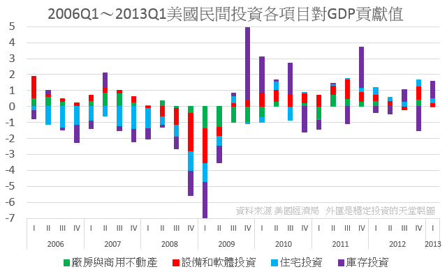 美國商務部公佈,2013年第ㄧ季實質國內生產總值(GDP)成長年率經季節調整後為2.5%,主要受到個人消費支出(PCE)、民間庫存、出口、住宅投 資以及非住宅固定投資增加的帶動,此抵消了政府支出下滑以及進口(GDP的減項)增加的影響。根據路透社的調查,經濟學家原先預期美國首季GDP將成長 3.0%,第ㄧ季民間庫存對GDP成長的貢獻度為1.03%,部分受到農戶回補穀倉庫存的影響,因2012年夏天的乾旱損害作物生產,前季為 -1.52%。民間企業庫存在第ㄧ季增加了503億美元,高於2012年第四季的133億美元。汽車產值對實質GDP成長貢獻度為0.24%,優於前季的 0.18%;電腦銷售產值貢獻度為0.01%,低於前季的0.10%。