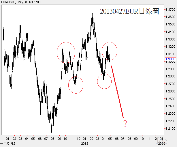 | Dow Jones | (請勿參考本圖的時間軸,數字符號放大占空間,不等於發生時間) ![]() 道瓊指數2013年內發生機率較高的走勢逐漸演變成三種,不過藍色和紅色1與2的位置仍然不變,因此美股可以在可承受的投資風險內,緩和增持美股到今年德國大選以前,上週五公布的美國GDP成長狀態,仍然維持樂觀看法 |