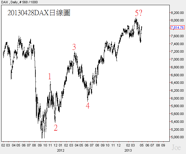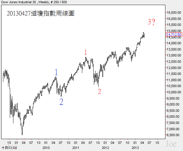 | Dow Jones | (請勿參考本圖的時間軸,數字符號放大占空間,不等於發生時間) ![]() 道瓊指數2013年內發生機率較高的走勢逐漸演變成三種,不過藍色和紅色1與2的位置仍然不變,因此美股可以在可承受的投資風險內,緩和增持美股到今年德國大選以前,上週五公布的美國GDP成長狀態,仍然維持樂觀看法 |