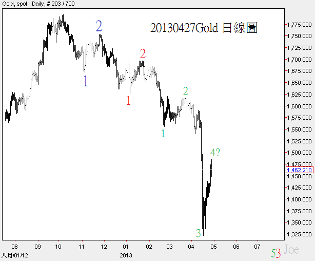 跌勢確實比預期的來的快,都已經跌破US$1500了,後續就是跑這兩周分析所畫的衍生浪,發展夠快的話,價格還有可能在下修,未必只維持震盪走勢