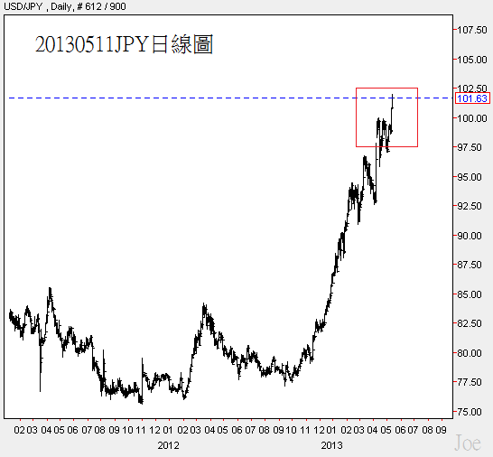JPY在100的價位以下撐了幾天後,短線上突破100到102的價位區間,雖然弱勢JPY對日本經濟有利,日股也可以持續維持具備投資的價值維持長久緩和貶值,讓全球投資人產生長線弱勢JPY的效應,會比快速貶值來的理想,也可以避免日本國內物價震盪太快的情況在未來上演