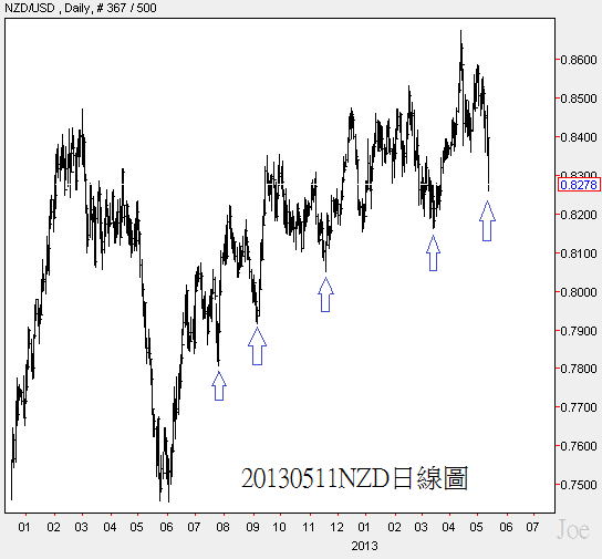 NZD雖然近期出現跌勢,但近一年來,NZD價位維持步步高升的走勢,藍色箭頭的價位仍然在上漲趨勢,如果AUD和NZD在今年轉為弱勢,那麼就更加驗證原物料的多頭時代暫時結束了