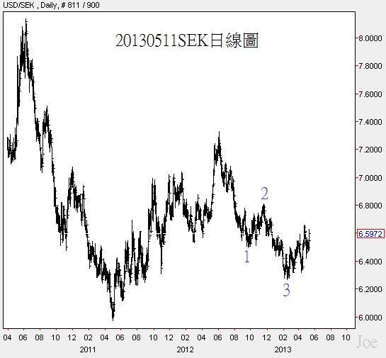 ,目前日線圖已經跑出3浪結構,SEK算是歐系貨幣中相對抗跌的貨幣,如果連SEK都進入跌勢,那麼其他歐系貨幣就更難維持目前的價位,緩和貶值的機率較高
