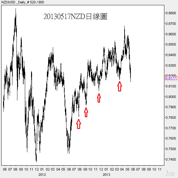| NZD | ![]() NZD價位跌破了右邊第一個紅色箭頭的價位,長線上漲趨勢結束的機率大幅增加 |