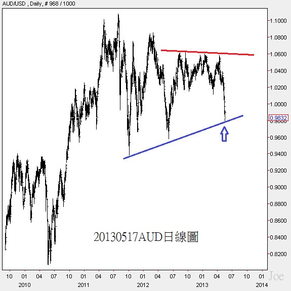| AUD | ![]() AUD/USD日線圖上始終維持在紅線下方,目前來到了近兩年來藍色底線的位置,這個價位收周線依然拉不起來的話,AUD的空頭趨勢會轉為更明顯 |