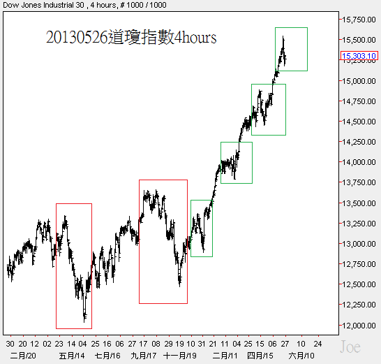 | Dow Jones | (請勿參考本圖的時間軸,數字符號放大占空間,不等於發生時間) ![]() 道瓊指數近半年來都沒有出現類似2012年紅色框框內的千點以上回檔,反而是出現類似綠色框框內的五百點左右的回檔,因為已經超過兩組轉折浪,按照衍生浪的發展邏輯,接下來理論上會是四組轉折浪,投資人看好長線美股仍然可以維持價格有創近期低點就加碼買一些的操作策略,慢慢的增加美股部位即可 |