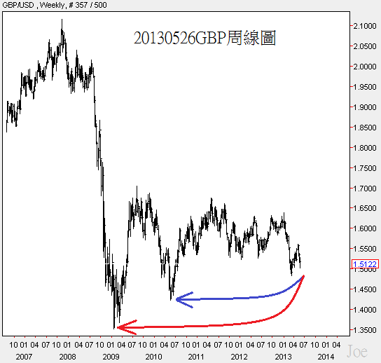 | GBP | ![]() 英國央行最好還是繼續維持量化寬鬆的貨幣政策,維持對歐元的弱勢,如果能摜破藍色箭頭的價位,長線跌破藍色箭頭的價位,那麼對英國的長線經濟發展較為理想,英國已經逐漸失去競爭力,弱勢貨幣挽救經濟的重要性就會越來越明顯 |