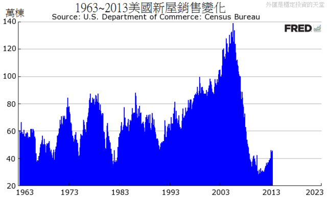 1990年以前,美國總人口約2.5億,每個月銷售40萬戶是低潮期,如今2013年,美國總人口超過3.2億,每個月銷售40萬戶是熱賣期?