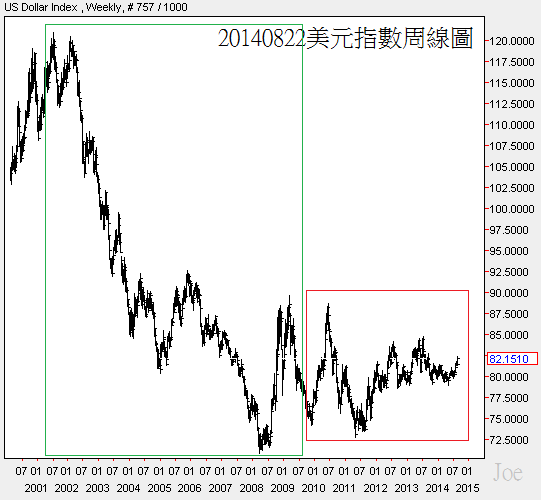 20140822美元指數周線圖最近十多年來,美元指數幾乎是大幅度走跌,一來是歐系貨幣升值非常快,佔的比重也高,二來,Bush時代的高債務發展模式,讓美元價值大幅稀釋,也就是圖上綠色框框的部分,但2011年以來,美元已經進入了另一個趨勢,我不能說美元就此開始大幅升值,但歐元區已經進入長期寬鬆貨幣政策的模式,加上美國金融帳、資本經常帳的結構已經出現巨大的變化,所以美元指數未來數年要大幅走貶的機率已經大幅降低,明年中美元即將升息,如果小型經濟體為了不讓資金外流,升息速度快過美國,那麼風險也會相當大,升息速度太慢,則是會面臨資本外流,屆時還要觀察各國貨幣的跟進升息速度,才能判斷各國貨幣的漲跌變化,等有更多徵兆我再來撰文說明看法