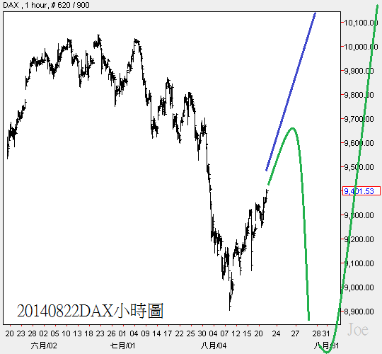 20140822DAX小時圖德國股市價格目前已經反彈超過,先前跌勢價差的1/3,接下來預估是往2/3邁進,超過2/3的話,價格很高機率就能再突破新高點,也就是藍色線的位置