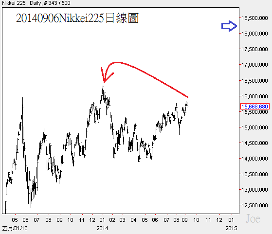 日幣的跌勢非常高機率會帶動日經225擴大漲勢,突破紅色箭頭價位只是時間問題,如果美元未來數季可以擴大走強,那麼日幣貶值會更有利,日股上漲甚至可以超越2007年的高點價位,不過那是長遠目標,屆時還得靠美元幫忙推一把才行