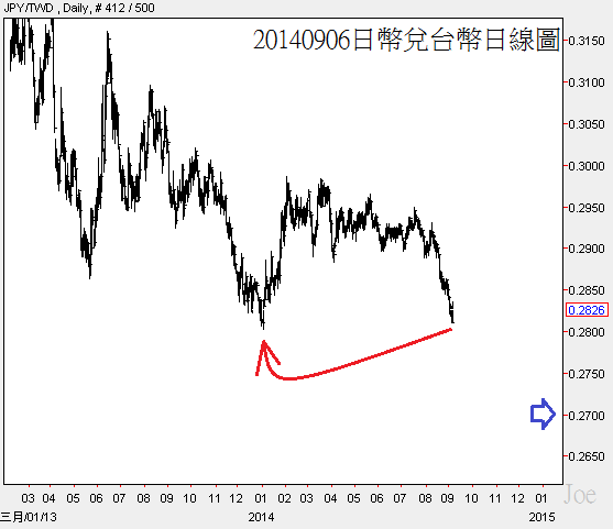 美元2015年中升息的機率越來越高了,未來幾個季節裡,日幣對美元貶值的機率也會大幅提升,理論上台幣貶值速度會比日幣慢,所以日幣對台幣還會再貶值的機率頗高,我認為跌破紅色箭頭低點只是時間問題,長遠來看甚至會跌破藍色箭頭US$0.270的價位,對日幣有需求的讀者,等需要日幣時再進場購買即可,擔心或急需的話,可以分批購買,分散風險