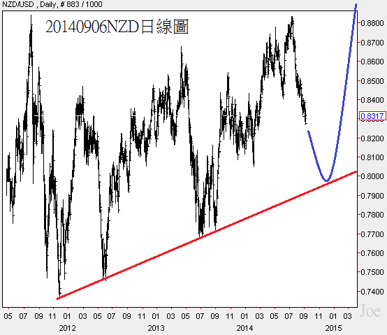 紐幣近期持續擴大跌勢,2011年以來,出現過至少三次這樣的大跌勢,我認為未來一年內,很高機率還會重演這樣的歷史走勢,價格先大幅走跌到紅線上,然後底部盤整,接著反彈上漲,從波浪的結構來看,紐幣還會有更高的歷史價位,只是需要再等一段長時間,大約是2015年中以後的發展