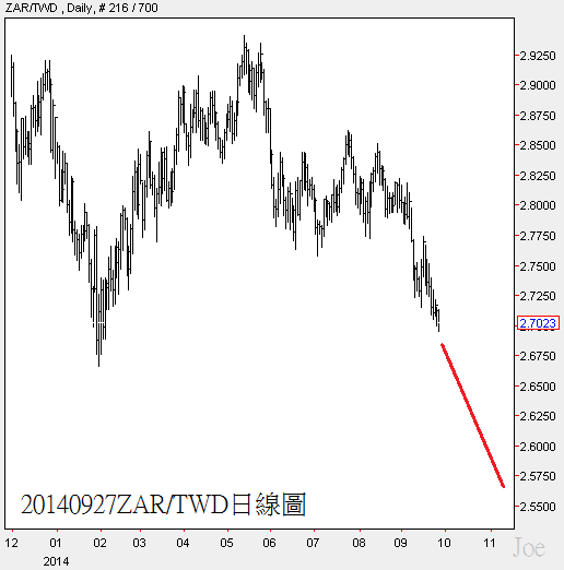 南非幣兌台幣的線圖目前相當不樂觀,今年一月有出現NT$2.675的價位,只要今年內在跌破1月低點,那麼新低價位還會在屢次出現,這是日線圖上的下跌衍生浪,南非幣的投資人得多注意投資風險了