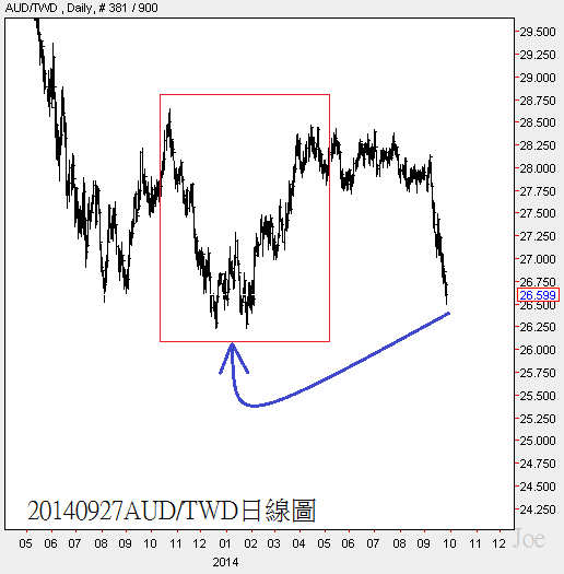 澳幣在今年初大約2季的時間完成了一個W底部型態不過近期這個漲勢已經完全崩解如果出現藍色箭頭的跌破價位那麼澳幣兌台幣極高機率還會出現跌破NT$25.0的新低浪目前不建議投資人去加碼撈底原物料貨幣強勢美元崛起原物料和原油與貴金屬短期內的投資效益都會相對低迷