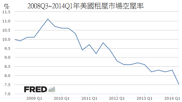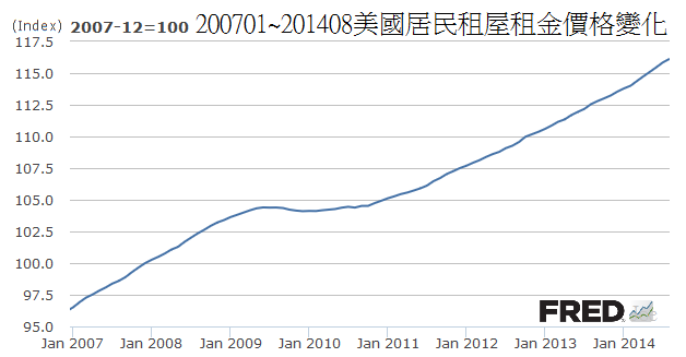 美國租屋市場的租金持續在攀升,美國租屋市場是透明公開的,這是供需原則所造成的租金上升,建商不敢增建太多新屋,民眾能購屋的數量增加不夠快,或者不敢購屋,大量人口湧入租屋市場,造成租金上揚,2011年市美國房地產業最糟的時刻,租屋成本指數停滯成長至少一年以上,直到2011年才又開始成長。