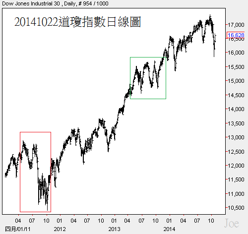 請問你在道瓊日線圖框綠線的意思是表示:目前道瓊走勢也有可能走綠色框框的模式嗎?