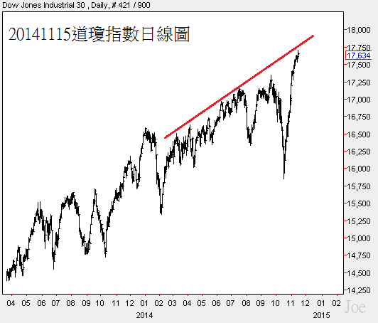 近期美國經濟數據仍然相當穩定大震盪的頻率會越來越高空頭不要太悲觀多頭也不用太樂觀維持一手現金一手現貨,如果美國升息點從第二季延後到第三季那麼2015年第一季出現空頭走勢的機率會比較高但目前我仍然是評估美國第二季會升息的機率最高道瓊指數最近一年的漲勢幾乎都維持在紅線以下投資人提高警覺但不用太擔心巨大空頭出現短線上要立刻出現2000點以上修正的機率是比較低的做好籌碼控管空頭並不危險反而是轉機
