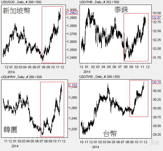 過去幾個季節裡新加坡幣和韓圜都是亞洲地區相對強勢的貨幣台和和泰銖也是但今年7月以來四個貨幣兌美元同步貶值其中三個已經是今年以來最低價位隨著美元升息的壓力逼近亞幣長線強勢的機率已經逐漸動搖投資人投資新興市場商品時務必要注意該國貨幣動向避免投資地區商品獲利但使用的貨幣卻因為大貶而效益減低例如南非和日本的金融商品就是典型例子